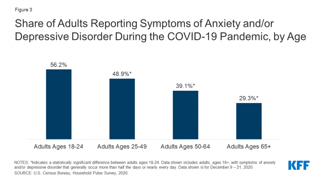During the COVID-19 pandemic, mental health challenges have indeed adversely impacted more younger people than people 25 and older. The bar chart from Kaiser Family Foundation’s look into mental health in 2020, illustrates that pandemic mental health reality, that over one-half of people between 18 and 24 reported symptoms of anxiety or depression during the public health crisis, with the incidence of feeling anxious or depressed declining with age.