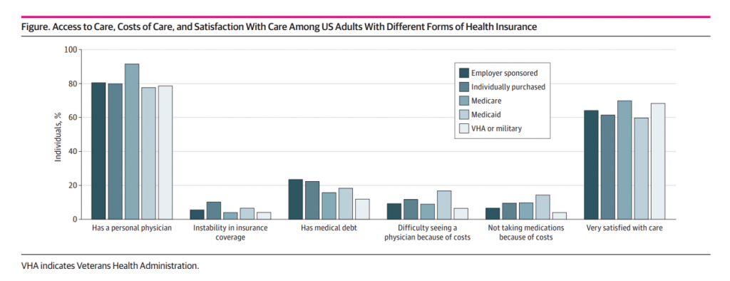 As the last chart from the JAMA study illustrates, patients covered by employer sponsored care tended to land on the higher side of having medical debt. At the same time, they were not as satisfied with their health care as people enrolled in Medicare or a VA/military health plan.