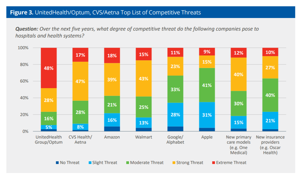 The second bar chart (labeled Figure 3) illustrates some of the most competitive threats Kaufman Hall’s research identified. The most visible threat was seen from UnitedHealth Group, with 3 in 4 hospitals noting UHG as a formidable threat to their health system business. CVS Health/Aetna, Amazon, and Walmart rank in the next-most competitive group impacting hospitals, followed by new primary care models.