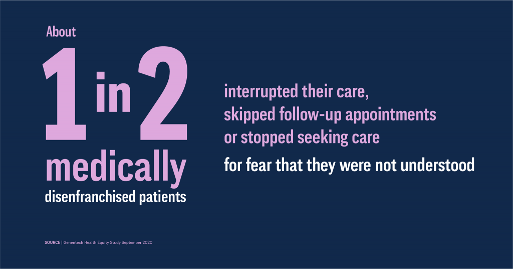 - There are gaps between intention and perception in the patient-provider relationship: patients and HCPs are not aligned in their belief that clinicians are sensitive to their patients’ emotions and feelings. One in 2 medically disenfranchised patients said they stopped seeking healthcare because they didn’t think their HCP understood them or would really help them. One-half of these patients also were fearful that if they asked questions of their HCP, they would look unintelligent (Genentech’s word) in front of the clinician