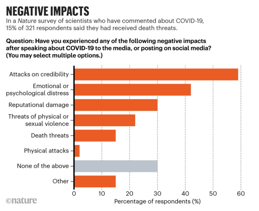 - An escalation during the coronavirus pandemic of scientists being threatened (from reputations to lives), published in Nature.