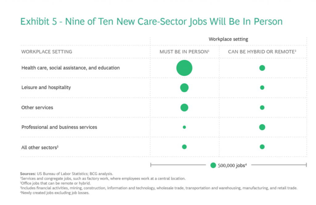You’ll learn that 9 of 10 new care-sector jobs will be in-person for health care, social assistance, and education — only a fraction of which can be performed on a hybrid or remote basis.