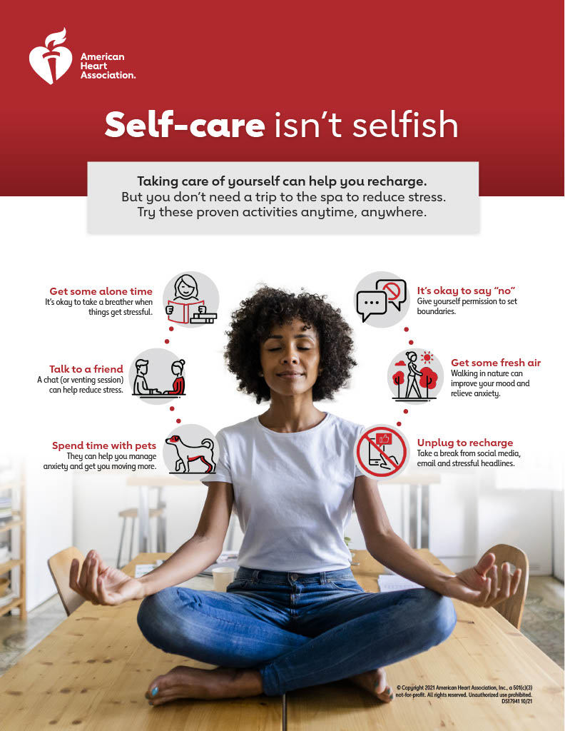 Health Populi’s Hot Points: Self-care isn’t selfish, the American Heart Association reminds us. There are many things we can do to lessen stress and take care of our hearts, some shown in the infographic from AHA.
