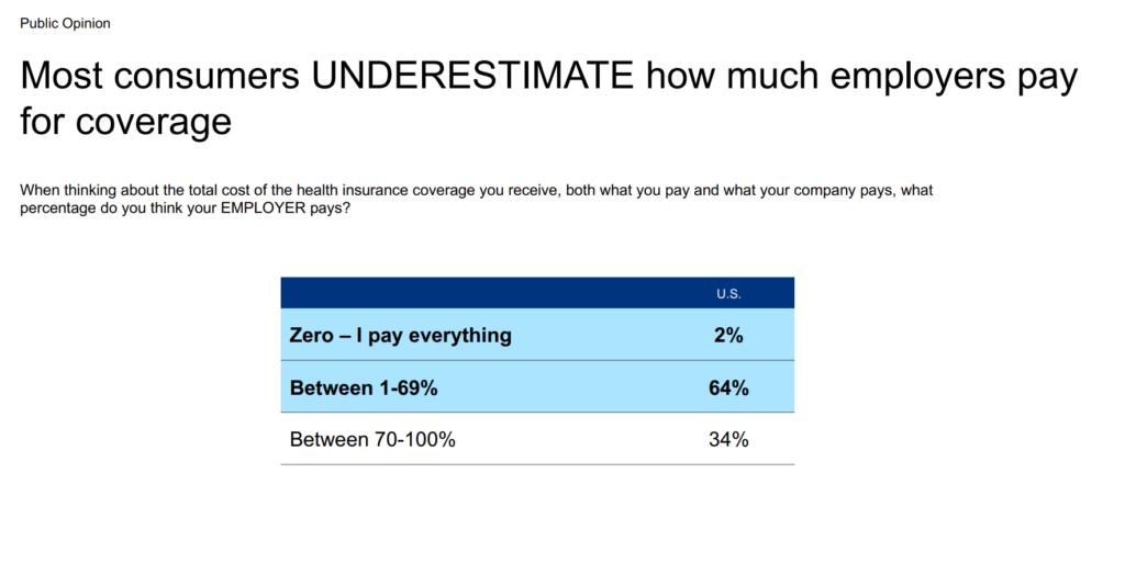 The first chart from the study shown here tells that most consumers underestimate how much employers pay for coverage — with two-thirds believing employers pay up to 69%.