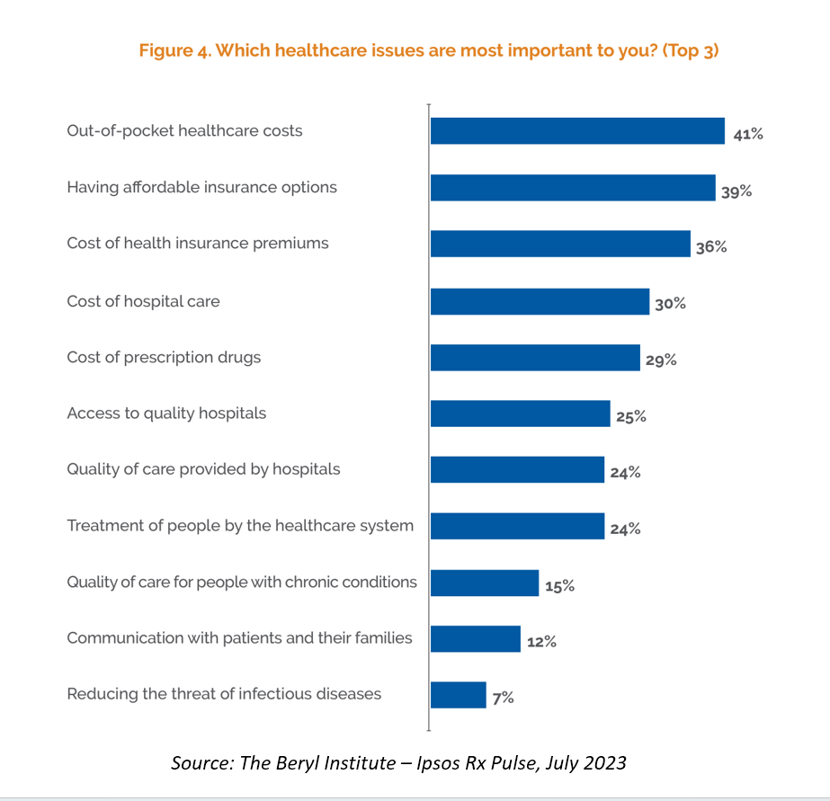 Out-of-pocket healthcare costs rank top (for 41% of people), followed by affordable health insurance options (39%), cost of health insurance premiums (36%), cost of hospital care (30%), and cost of prescription drugs (29%).