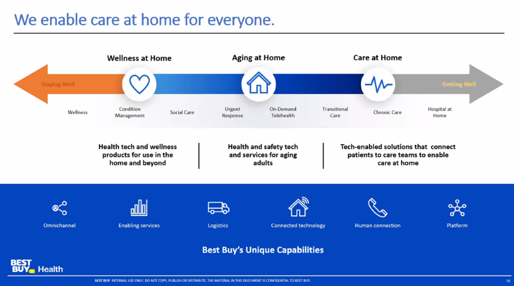 Health Populi’s Hot Points: Some of that evidence is being generated right now through the deployment of care at home channeled through Best Buy Health, which Deborah Di Sanzo discussed in the webinar. Deborah shared Best Buy’s “one-page strategy” shown here on a continuum of care from wellness at home through to aging at home and then care at home — the latter of which encompasses the HaH concept outlined in the npj Digital Medicine essay.