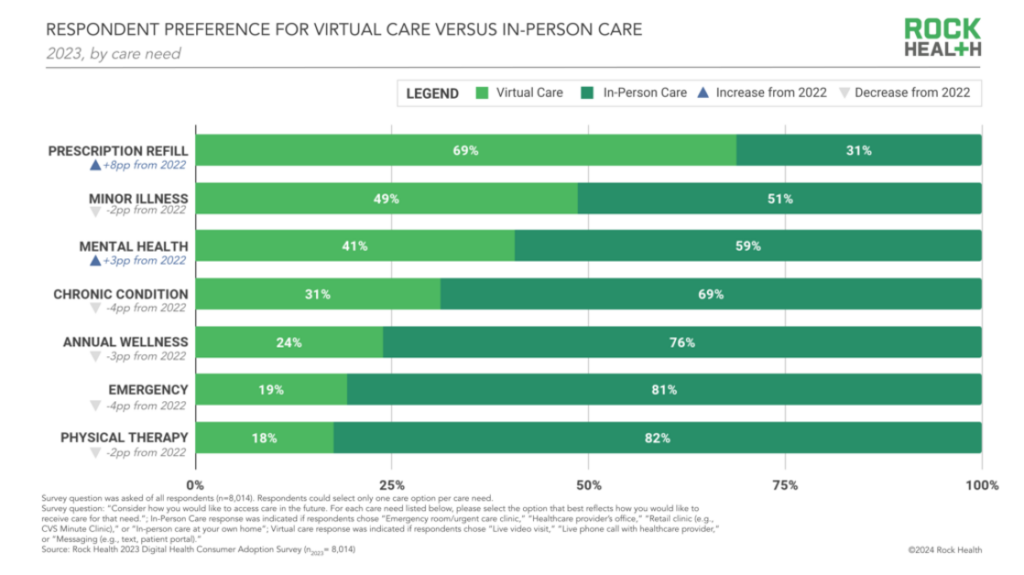 Convenience and waiting time are the top two reasons for choosing virtual over in-person care, Rock Health found. While virtual care is ubiquitous across the U.S. health care delivery landscape, patients-as-health care consumers are becoming more savvy and discriminating based on their “maturity” and exposure to various flavors of telehealth.