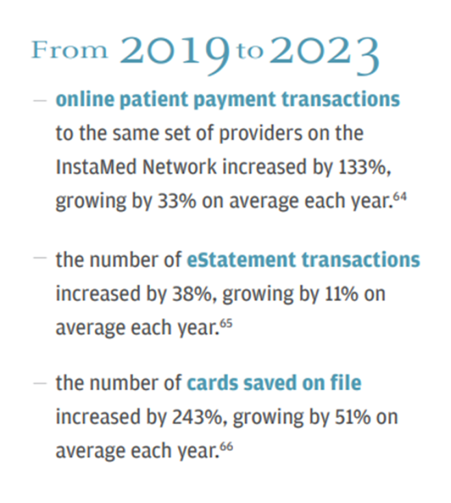 Health Populi’s Hot Points: This last graphic includes three data points illustrating that consumers have been shifting their payment behavior online and via digital formats since 2019. Patients-as-payers are using credit cards much more frequently, working with eStatements (opting out of paper-based communications as they have done for other bill types), and submitting payments online — InstaMed noting their online patient payment transactions have grown 33% per year between 2019 to 2023.
