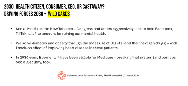 This post follows up Part 1 of a two-part series I’ve prepared in advance of the AHIP 2024 conference where I’ll be brainstorming these scenarios with a panel of folks who know their stuff in technology, health care and hospital systems, retail health, and pharmacy, among other key issues.