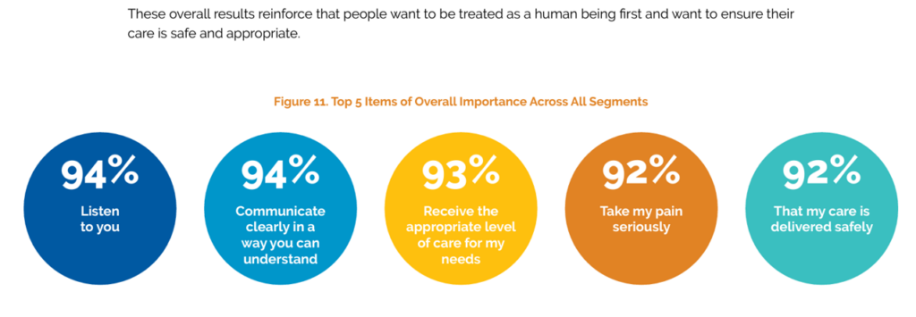 So the top five priorities noted in the circle graphic say a lot about what underpins a health consumers’ personal report card on what’s most important in that experience — that is,