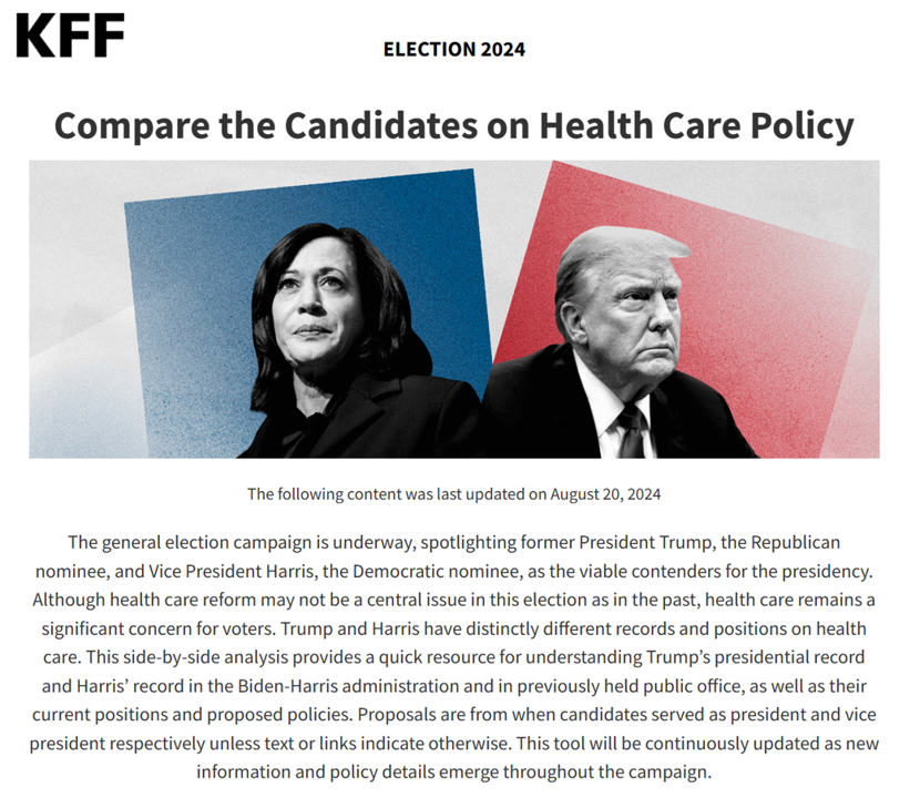 Health Populi’s Hot Points: If voting is a driver of health, than each of us has an opportunity to get healthy by getting informed about health policy. Here’s a link to the Kaiser Family Foundation comparison of health policies for Kamala Harris and Donald Trump which provides details under a dozen of broad health policy areas including the Affordable Care Act, Medicaid, Abortion, Contraception, LGBTQ+ Health, Gun Violence, Public Health, Prescription Drug Prices, Medicare, Health Care Costs, Mental Health, Opioid Use, Long Term Care, Global Health, and Immigrant Health Policy.