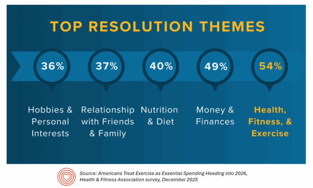 Timed at the start of the 2026 New Year, HFA identified consumers’ top resolution themes: at the top of priorities, over one-half of people cite health, fitness, and exercise, followed by attending to money and finance with 1 and 2 resolvers seeking to be financially fit.