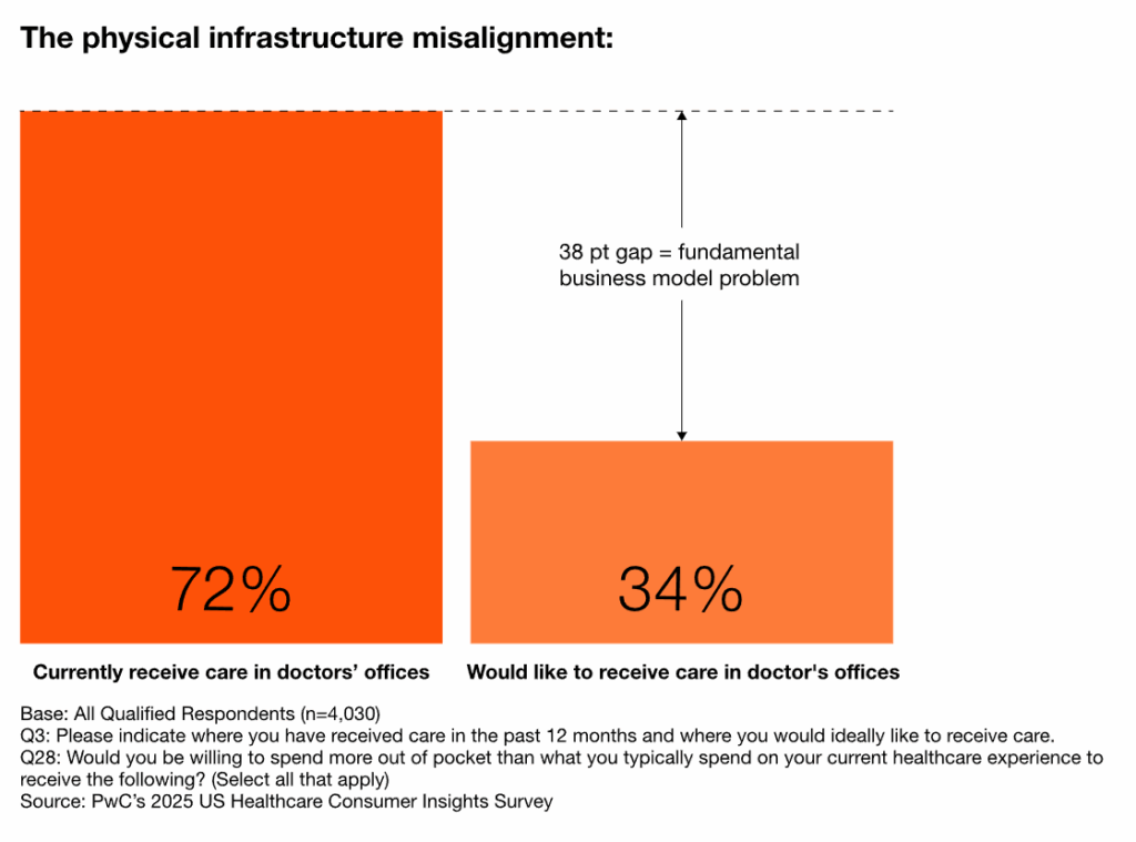Patients-as-consumers are looking for greater access to virtual, at-home and retail models for care — with the current mode of care a business mis-alignment problem as well as a real estate and capital mis-alignment.